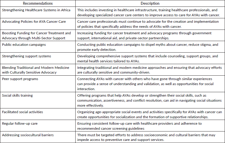 Based on the analysis of the specific barriers to advocacy for AYAs with cancer in Africa, the following recommendations are hereby made (Table 1).