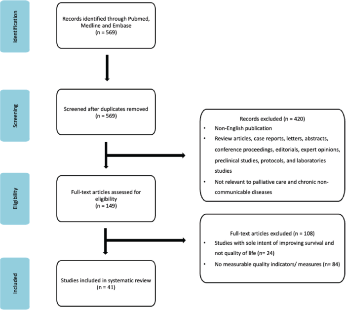 569 publications potentially relevant to QIs and POMs for palliative care were initially identified by the complex bibliometric filter. After the abstracts and titles were screened, 420 studies were not included due to them being (1) review articles, case reports, letters, abstract, conference proceeding, editorials, expert opinions, preclinical studies, protocols and laboratories studies, (2) not relevant to palliative care and chronic non-communicable disease and (3) non-English. Of the remaining 149 studies, a further 107 studies were excluded as 24 studies focused solely on improving the survival of the patients instead of their quality of life; and 84 studies did not utilise any measurable palliative care QIs or POMs. 41 publications fulfilled the search criteria and are summarised in Tables S1 and S2 (Appendix A and B). The search strategy is illustrated in Figure 1.