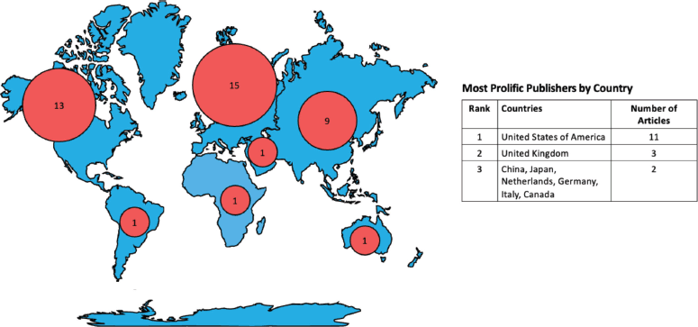 As illustrated in Figure 2, Palliative care research in quality indicators and patient outcome measures was highly concentrated in Europe, 36.6% (n = 15), [29, 34, 37, 38, 40–42, 47, 49, 51, 52, 54, 56, 57, 60] and North America, 31.7% (n = 13) [21, 23–28, 31, 32, 50, 58, 59, 61] especially the United States. Asia was the origin of 22.0% (n = 9) of the literature, [22, 30, 33, 36, 43–46, 55] whereas the Middle East, South America, Africa and Australia only contributed 2.4% each [35, 39, 48, 53]. Only 7.3% (n = 3) of literature was published from LMICs [35, 39, 44].