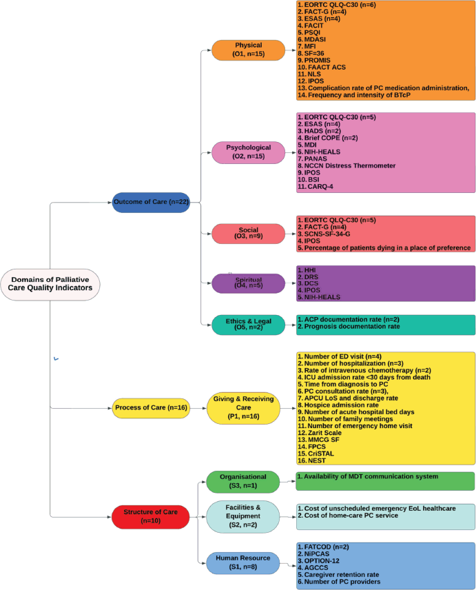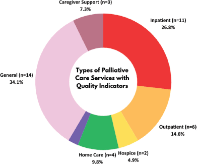 Results: 26.8% of studies focus on QIs, while 73.2% used POMs. >90% of palliative care research took place in high-income settings. Across domains of palliative care, the outcome of care is most studied, while the structure and process of palliative care are understudied. QIs and POMs identified often had overlapping themes. Due to the multidimensionality and intricacy of palliative care, evidence is limited, patchy and heterogenous in quality.
