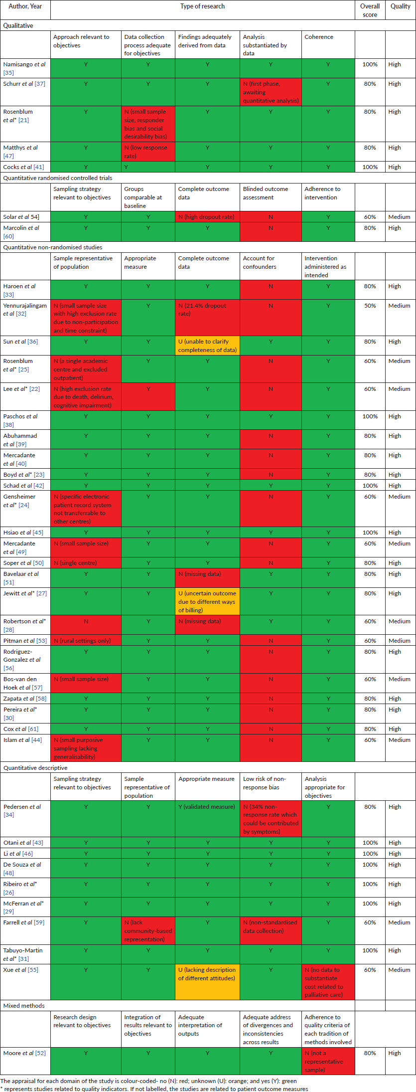 Methods: We undertook a systematic review following the Preferred Reporting Items for Systematic Reviews and Meta-analysis guidelines to determine the QIs and/or POMs of palliative care in patients with non-communicable diseases. A Web of Science, EMBASE, PubMed and SOCSCI search between 1 January 2013 and 31 Dec 2022 identified 41 articles. We appraised the quality of all studies using the mixed methods appraisal tool.