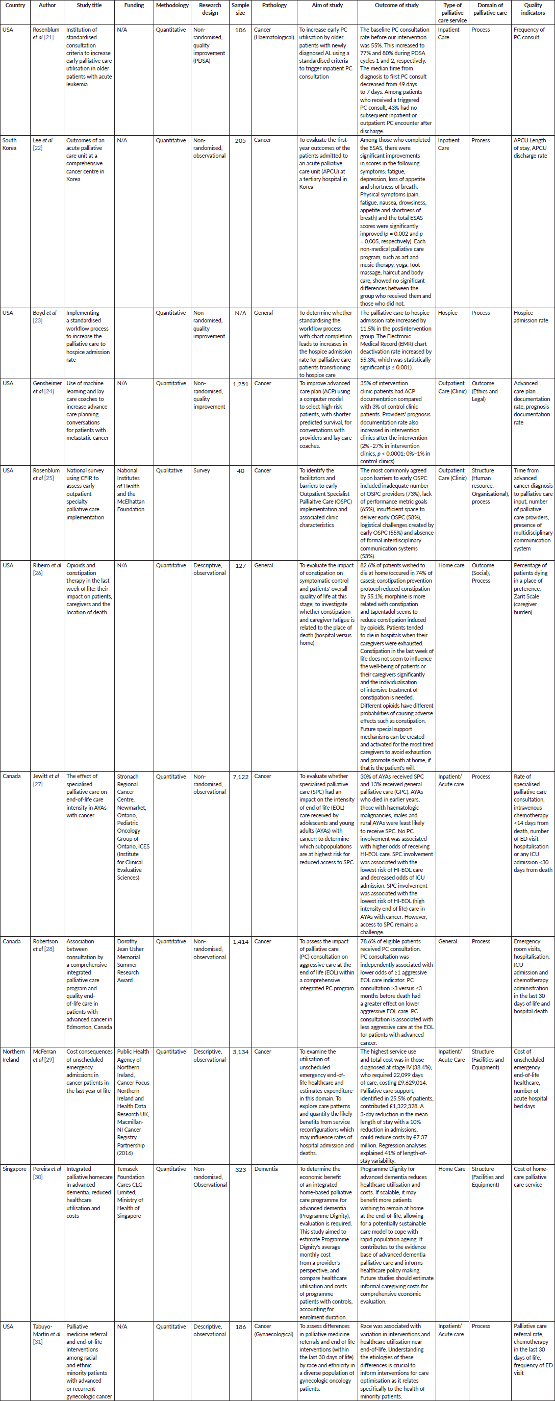 Table S1. Summary table of all included palliative care quality indicator studies.