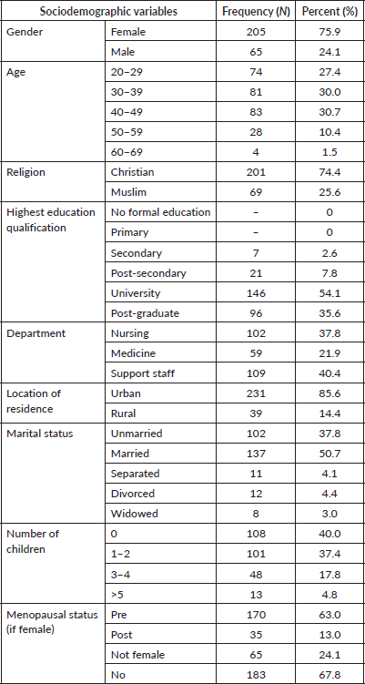 A total of 270 questionnaires were distributed and retrieved. This gave a response rate of 100%. The sociodemographic characteristics of the respondents included their gender, age, religion, highest education qualification, department, location of residence, marital status, number of children, menopausal status and family history of cancer. Table 1 shows the sociodemographic characteristics of 270 sampled respondents. The sample of members of staff was mostly 205 (75.9%) female, 20–29 years 74 (27.4%), Christians 201 (74.4%), University graduates 146 (54.1%), nurses 102 (37.8%), urban residents 231 (85.6%), married 137 (50.7%), nulliparous 108 (40.0%) and premenopausal 170 (63.0%), with no family history of cancer 183 (67.8%).