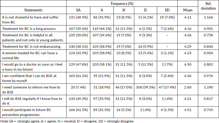 Table 3 shows that the majority of participants agree that it not being shameful to have and suffer from BC and that treatment for BC is a long process. Similarly, the majority agreed that the treatment for BC is helpful to all patients, not embarrassing and that the woman can have a normal life after treatment of BC. Additionally, the majority strongly agreed to going to a doctor as soon as they feel a mass in their breast, being confident in doing a BSE, doing a BSE regularly if they know how and participating in future BC prevention programmes, as the mean value for the statements was above 4.20. The majority of the population reported disagreeing with needing someone to inform them on how to do BSE, as is seen in the mean of 2.6.