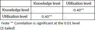 A Pearson correlation was used to examine the association between level of knowledge and utilisation, which revealed a low positive and statistically significant result (r = 0.40, p < 0.001). This suggests that an increase in the knowledge level would lead to a higher utilisation level, as shown in Table 4.