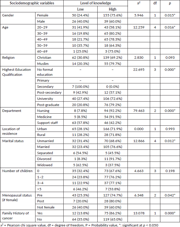Chi-square statistics were used to examine the relationship between the sociodemographic variables of respondents and the knowledge of BCSM. The results of the chi-square test of Association are summarised in Table 5.
