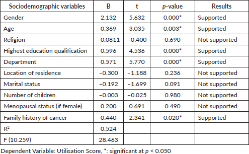 From Table 6, the results revealed that gender (B = 2.132, t = 5.632, p < 0.001), age (B = 0.369, t = 3.035, p = 0.003), highest education qualification (B = 0.596, t = 4.536, p < 0.001), department (B = 0.571, t = 5.770, p < 0.001) and family history of cancer (B = 0.440, t = 2.341, p = 0.020) have a significant and positive impact on utilisation of BCSM. Hence, they were supported.