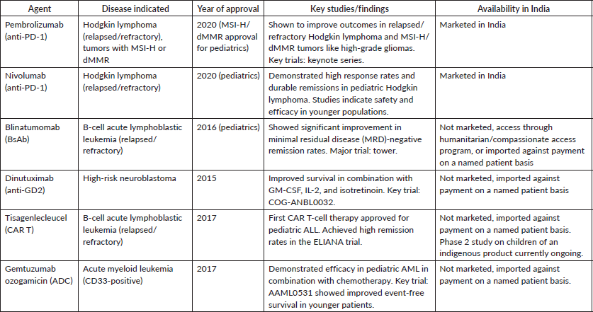 Table 1. Immunotherapeutic agents approved for use in pediatric cancers.
