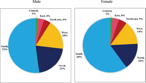 Of the 10,521 (males 3,340 and females 7,181) new TC cases, the highest relative proportion [compared to all cancers (ICD-10: C00-C97) in the respective region] was observed in the South (1.7% and 3.8%) and the lowest in the Central region (0.3% and 0.7%) for males and females, respectively. The region-wise proportional difference was statistically significant in both genders (p-value < 0.001 for both males and females) (Figure 1).