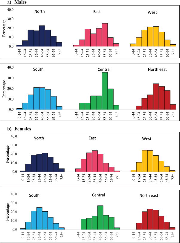 Supplementary Figure 2. Region-wise thyroid cancer from HBCRs in India: age-distribution by gender a) Males b) Females.