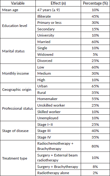 The study enrolled 100 patients with a mean age of 47 years (± 9). The majority of participants were married (60%) and with a low income. Table 1 summarises the demographic and clinical characteristics of the cohort.