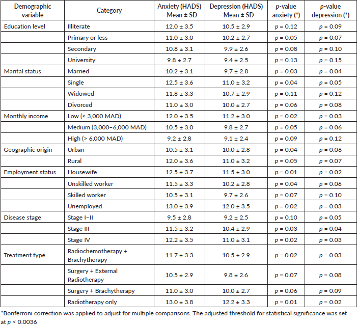 In univariate analysis, higher levels of anxiety and depression were observed among married women, housewives, those with low income and patients with locally advanced stages of the disease (Table 2).