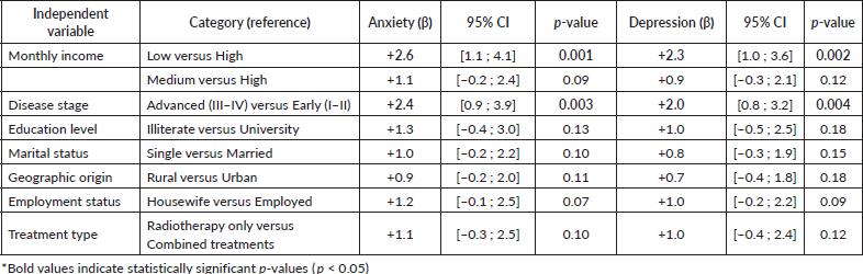 In multivariate analysis, only low income and advanced disease stage significantly impacted anxiety and depression levels (Table 3).