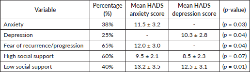 Table 4. Prevalence and mean scores of anxiety, depression, fear of recurrence/progression and the impact of social support on these psychological factors in the study population.