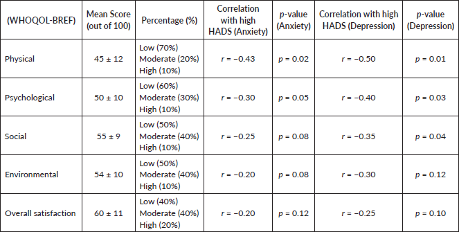 The QoL, as measured by WHOQOL-BREF, showed moderate scores across all domains, with physical and psychological health being the most affected. The results reveal a significant correlation between HADS scores and the domains affected by these emotional disorders Table 5.