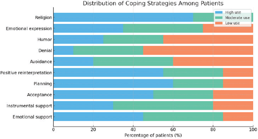 The majority of patients employ active coping strategies, including seeking social support and planning. However, a particularly striking aspect is the prominence of religious coping strategies: 85% of patients turn to spiritual practices, such as prayer, to manage anxiety and depression associated with the fear of recurrence, followed by reliance on family support. These approaches were linked to lower levels of anxiety and depression Figure 1.