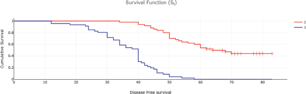 Figure 4. DFS of CRC patients according to stage 2-stage 1+2 , 3-stage 3.