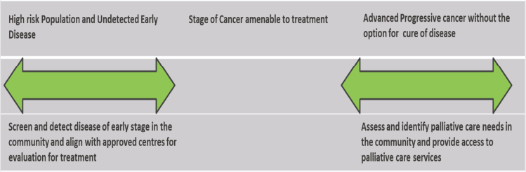 Figure 1. Shows the primary healthcare interventions planned across prevention, early detection and palliative care services for cancer care in the outreach. The green arrows are indicative of the two divergent ends of the cancer care conducted as a part of primary healthcare services.