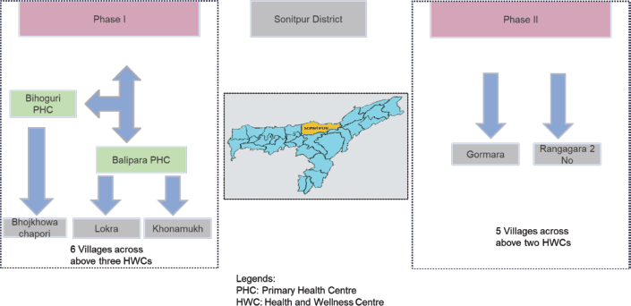 A MoU was signed by Tata Trusts, a Non-Governmental Organisation (NGO), with the Government of Assam for the effective implementation of the project. Some of the major provisions of the MoU were to a) design and implement a cancer control programme for prevention, early diagnosis, clinical down-staging, improved treatment, survival and cure rates and better palliative care, b) integrate and upgrade comprehensive cancer-related infrastructure, personnel and services across the state from the primary health centre to tertiary referral cancer hospitals and c) devise a cancer control programme that is innovative, evidence-based, locally appropriate, low cost and cost-effective. Sonitpur district was chosen due to the necessary administrative approval from the government, ongoing collaborative team activities and access to cancer care and palliative care for screen-positive cases. Figure 2, Intervention District and Health Facilities, shows the selection of the health facilities in the districts.