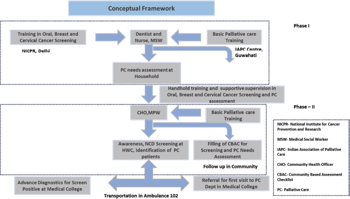 A two-phase project was devised to achieve the objectives. A four-member team of a dentist, a nurse, a medical social worker and a data entry operator was constituted. The dentist and the nurses were trained in screening for NCDs, including common cancers (oral, breast and cervical) at the National Institute for Cancer Prevention and Research. The same team underwent generalist palliative care training in an essential certificate programme conducted by the Indian Association of Palliative Care at the nearby centre in Guwahati. Appendix 1, named Training Schedule for Cancer Prevention, Early Detection and Palliative Care for Dentists and Nurses of the supplementary is attached for the training curriculum and schedule. While In the first phase, this team primarily conducted the needs assessment for palliative care at the HWC with the support of the frontline health workers using the Palliative care questionnaire integrated into the Community based assessment checklist shared in Appendix 2, in the second phase it played the role of master trainer and provided hands-on training to the frontline health workers (Community Health Officers, Multipurpose Health Workers and the ASHAs) to conduct awareness and screening for NCDs including the three common cancers (oral, breast and cervical) and facilitate assessment of palliative care needs by training the ASHAs on filling the Community Based Assessment Checklist (CBAC) forms. Linkages with the specialist department at the cancer centre and medical college were set up, and the team also helped develop a pathway for referral of the screen-positive cases arising from the screening for further diagnostic tests for confirmation of cancer. The conceptual framework and referral pathway for the Prevention, Early Detection and Palliative care (PEP) study, as well as the implementation of the PEP interventions, are shown in Figure 3 and Figure 4, respectively, with the same names.