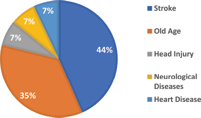 Figure 5. Shows the percentage of the types of diseases requiring palliative care during the needs assessment in phase I of the project. The data shows that the highest percentage of patients requiring palliative care is composed of stroke patients (44%) depicted in deep blue, followed by old age. (35%) depicted in orange. While head injury, neurological and heart patients contributed equally (7%), depicted in grey, yellow and light blue, respectively.