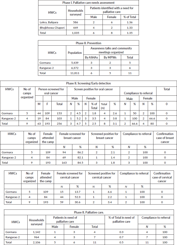 In the second phase, a total of 2,106 households were covered, targeting a population of 11,811. A total of 11 talks and community awareness meetings were organised by the frontline health workers during the study period. 9 camps were organised in which a total of 256 people attended (Male: 63 and Female: 193) and were screened for oral cancer through oral visual examination methods. 163 females out of the total 193 participating females were eligible for breast cancer screening and were screened through the clinical breast examination method. 59 females out of the total 193 participating females were eligible for cervical cancer screening and were screened through visual inspection with the acetic acid method. Screen positivity rates were found to be 3.1% for oral cancer (in males, 4.76% and females 2.59%), for breast cancer, it was 1.8%, while for cervical cancer, it was 3.4%. All cancer-positive cases were counselled and followed up for their confirmatory diagnosis, in which 75% of oral suspected cases (66.6% male and 80% female) were reached and did their confirmatory test at referred centres, and 100% of breast and cervical cancer suspected cases did their confirmatory diagnosis. None of the screen-positive cases of oral, breast and cervical cancer were found to be positive after their confirmatory test at the higher centre. In the second phase of screening conducted for palliative care by the public health workers, 0.5% households required palliative care. All of these were provided services through the palliative care physician from the Baptist Christian Hospital and follow up done through the nurse-led home care team of the hospital.