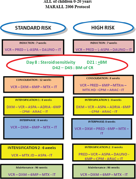 Treatment included induction, consolidation, intensification and interphase courses (11 months) followed by maintenance (2 years). Chemotherapy consisted of Vincristine, Doxorubicin, L-Asparaiginase, corticosteroids, high and low-dose Methotrexate, Cyclophosphamide, Cytarabine, 6-mercaptopurine and 18 doses of triple intrathecal therapy [9].