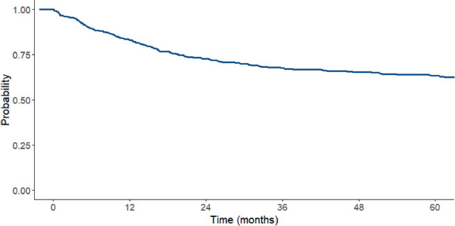 Patients were followed from the date of diagnosis to the occurrence of an event or until the study endpoint. The overall median follow-up time, including both deceased and surviving patients, was 63 months (16.5–91.7). However, for patients alive at the end of follow-up, the mean duration of follow-up was 83.1 ± 30.6 months (Table 4). The complete remission rate was 56.2%. The 5-year OS rate was 63% for the entire cohort. It is important to note that among patients who did not achieve remission, the 5-year survival rate was 12.8% (Figure 3).