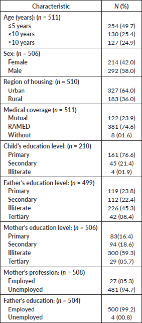 The median age of our population was 5.5 years with an interquartile range of (3; 9.75) years. We observed a predominance in the age group between 1 and 5 years, representing 49.6% (n = 254) of our sample. More than half (n = 327; 64%) of the patients were of urban origin. Most of our sample (n = 381; 74.6%) had medical coverage under the RAMED.