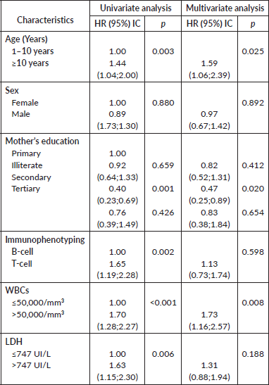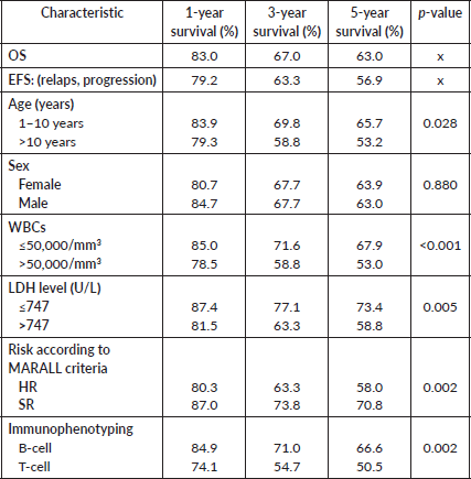 Results: Among the patients, 56.2% achieved complete remission after first-line treatment and 20.9% experienced relapse. The 1-, 3- and 5-year overall survival rates were 83%, 67% and 63%, respectively. Significant prognostic factors included age ≥10 years, white blood cell count >50,000/mm3 and elevated lactate dehydrogenase levels. Standard risk classification and B-cell immunophenotype were associated with better survival outcomes.