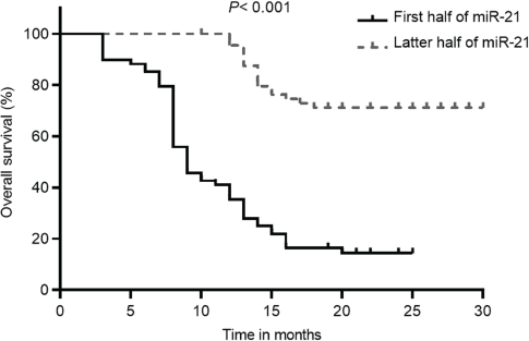 Figure 3. OS of patients with NSCLC with different levels of miR-21 according to the 50th percentile of miR-21 concentrations in the overall distribution.