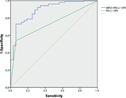 Figure 5. The ROC curve of miR-21 level and PD-L1 CPS for the ability to differentiate the responders of pembrolizumab in NSCLC patients.