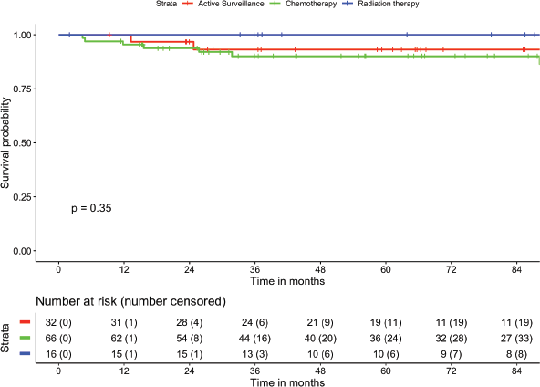 Despite only 43.8% of patients on AS strictly adhering to follow-up guidelines for at-least 2 years, there was no difference in long-term outcomes as compared to chemotherapy or RT in our study. Moreover, 33.3% patients who received chemotherapy did have some toxicity. The median RFS-2 in our patients was 69 months, which indicates that salvage treatment is effective irrespective of the treatment chosen at baseline. Therefore, a more lenient follow-up may be practiced for patients on AS. This will reduce economic burden on the patients and possibly limit radiation exposure by reducing the frequency of scans in a developing nation.