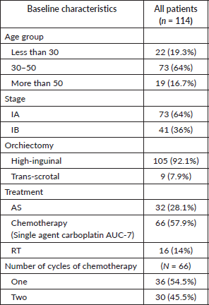 A total of 132 patients of stage 1 seminoma visited our outpatient clinic within the study period, of which 114 patients were included and analysed. The median age was 39 years (IQR: 32–48 years) (Table 1). Stage IA was more frequently seen and 105 (92.1%) patients underwent unilateral HIO. Chemotherapy (single agent carboplatin) was offered to 66 (57.9%) patients, which was well tolerated. AS was offered to 32 (28.1%) patients and RT to 16 (14%). Patients with high-risk features, such as involvement of rete testis or tumour size more than 4 cm, were offered 2 cycles of single-agent carboplatin.