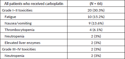 Toxicities were seen in 22 (33.3%) of 66 patients who received carboplatin. Two (3%) patients had grade III neutropenia, while the rest were grade I–II toxicities, which were managed on an outpatient basis (Table 2). Of the 22 patients who had toxicities, 11 (50%) patients had received 2 cycles of carboplatin. Toxicities were not associated with more cycles of carboplatin (p = 0.612).