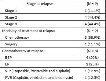 Out of 114 patients, 9 (7.9%) patients had radiological relapse, of which 4 (3.5%) were symptomatic. Of these nine patients, seven patients had received chemotherapy at baseline while two were on AS. Of the seven relapsed patients who had received chemotherapy at baseline, four had received two cycles carboplatin while three had received one cycle carboplatin. The median baseline pathological tumour size was 7 cm (range: 4.5–11 cm) in those who relapsed. All patients who relapsed had a baseline pathological tumour size >4.5 cm. Bleomycin, etoposide and cisplatin (BEP) was the most common regimen offered on relapse, followed by etoposide and cisplatin (EP) (Table 3). Only 14 (43.8%) of the 32 patients in AS had strictly adhered to the follow-up guidelines for atleast 2 years post treatment.