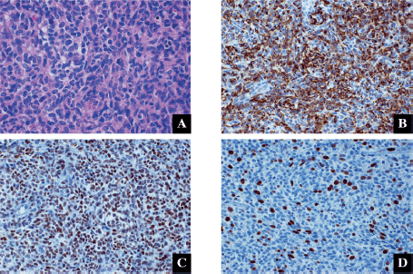 Figure 2. Synovial sarcoma histopathology. (a): Medium fusiform cells are observed, with oval-shaped nuclei and coarse chromatin. Hematoxylin-eosin 40×. (b–d): These cells express cytokeratins AE1/AE3 (b) and TLE-1 (c), with a proliferation index of 40% (d). 40×.