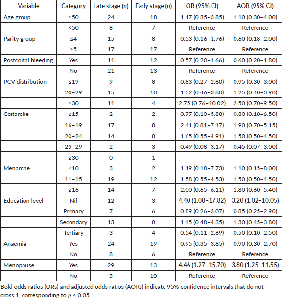 Results: Of the 102 women who presented during the study period, only 57 (55.9%) had complete staging, clinical and demographic data; these complete cases were included to ensure data integrity. From this population, 73.7% were aged 50 years or older and 56.1% presented with late-stage disease. Additionally, anaemia (packed cell volume <30%) was present in 75.4% of women. Postcoital bleeding was reported in 35.1% of cases. Women with no formal education had higher odds of late-stage diagnosis odds ratios (OR: 4.40, 95% CI: 1.08–17.82). Postmenopausal women also had higher odds of late-stage diagnosis (OR: 4.46, 95% CI: 1.27–15.70).
