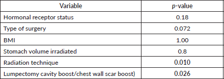 Materials and method: This prospective observational study analysed upper gastrointestinal (GI) toxicity in breast cancer patients receiving adjuvant RT. Patient demographics, clinical characteristics and dose-volume parameters for the stomach and esophagus were recorded. Statistical analyses identified predictors of RINV and esophagitis using univariate and multivariate models. Significant correlations were reported with a p-value <0.05.