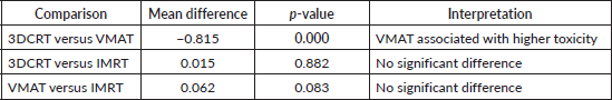 Further subgroup analysis using post hoc testing evaluated the association between radiation technique and upper GI toxicity, with significant differences observed among certain radiation techniques. Notably, patients treated with VMAT experienced slightly higher upper GI toxicity compared to those treated with 3DCRT with a mean difference of −0.815 (p = 0.000).