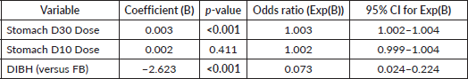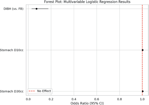 This model accounted for key confounders such as breathing techniques, stomach dose metrics, age and stage, confirming that DIBH provides a protective effect by reducing stomach exposure.