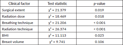 Univariate analysis revealed several significant associations between dysphagia grade and clinical factors (Table 6). Surgical extent was significantly associated with dysphagia severity (p = 0.019), with higher dysphagia grades observed in patients undergoing more extensive surgeries, such as mastectomy with axillary node dissection. Radiation dose was another significant factor (p = 0.018), with a linear trend (p = 0.012) showing increased dysphagia severity at higher doses. Patients receiving 4,256 cGy + boost were at the highest risk of developing Grade 2 dysphagia. Breathing technique showed a strong association with dysphagia grade (p < 0.001). Moderate dysphagia (Grade 2) was more common in patients treated with DIBH (56.7%) compared to FB (43.3%), while most patients with no dysphagia (85.3%) were treated with FB. Radiation techniques also significantly impacted dysphagia severity (p < 0.001). Grade 02 dysphagia was most frequent in patients receiving VMAT (80.0%), followed by IMRT (13.3%), whereas no dysphagia (Grade 0) was predominantly observed in 3DCRT patients (64.7%). BMI was significantly associated with dysphagia severity (p = 0.025), with obese patients accounting for 66.7% of Grade 2 cases. Although patients with larger breast volumes (≥1,000 cc) seemed more prone to higher dysphagia grades, the association did not reach statistical significance (p = 0.106). However, the likelihood ratio test (p = 0.014) suggested a possible trend.