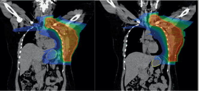 Radiation plan evaluation and approval were done by the primary radiation oncologist. During target volume evaluation, dose volume histogram (DVH) for OARs was also analysed, with emphasis on mean doses and percentage of volume receiving doses at various points on the histogram. All patients were treated in the supine position, and upper gastrointestinal (GI) toxicity and esophagitis experienced by each patient were assessed and documented weekly in chart reviews as part of general radiation-associated toxicity management.