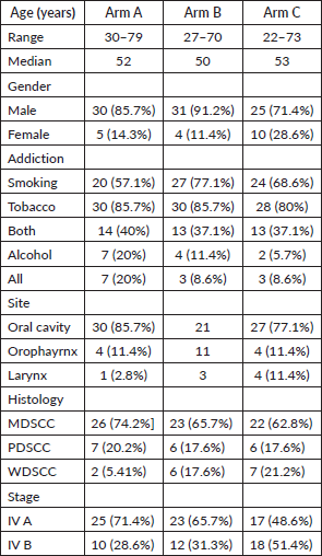 Median age of the study population was 52 years (30–79), 50 years (27–70), 53 years (22–73) with male predominant population of 85.7%, 91.2%, 71.4% in ARM A (Quadshot), B (Christie) and C (Conventional), respectively. The majority of the patients had addiction to chewable tobacco (85.7% in Arm A and Arm B, 80% in Arm C), followed by smoking and then alcohol. Buccal mucosa was the most common site involved (54.3%, 34.2% and 45.7%) with MDSCC being the major histology (74.2%, 65.7% and 62.8%) in ARM A, B and C, respectively. All the patients (100%) belonged to stage IV, with the majority in stage IV A in all the arms. The demographic profile has been depicted in Table 1.