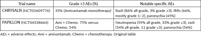 The safety profile of Amivantamab has been well documented in the CHRYSALIS and PAPILLON trials, particularly concerning IRRs, which occurred in about 66% of patients in the CHRYSALIS trial—most commonly during the first infusion. Chills, shortness of breath, flushing, nausea, chest pain and vomiting were typical symptoms of these reactions, which were typically mild to moderate in severity (grades 1 or 2). Antihistamines and antipyretics were usually prescribed to patients in advance to treat these occurrences and infusion rates were changed as needed [12, 18, 25].