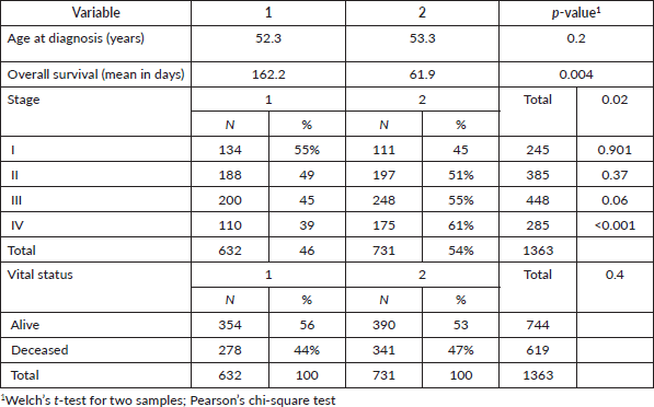 During the period analysed, 1,363 women diagnosed with cervical cancer were treated at the SOLCA Quito Hospital. Of these, 632 belonged to group 1 and 731 to group 2. The distribution of cancer stages is presented in Table 1.