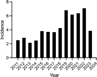 Over the 13 years, men had a slightly higher median incidence rate (4.09/100,000) than women (3.85/100,000). Peak rates were also higher in men (8.95/100,000 versus 6.28/100,000), indicating a statistically significant difference between sexes (p = 0.01) (Table 2).