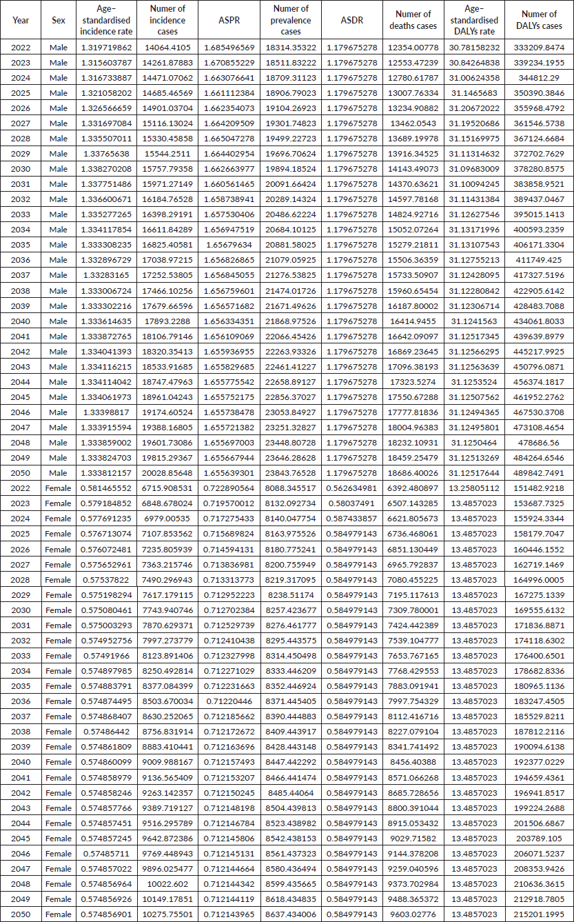 Predictions from the ARIMA and ES models suggest that between 2022 and 2050, the number of A-LC incidence cases, prevalence cases, deaths and DALYs will rise for both sexes. However, ASRs of incidence, prevalence, mortality and DALY are projected to decline for both sexes over this period (Figures 7 and 8; Tables 5 and 6).