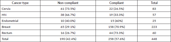 Table 3. Distribution of radiotherapy compliance across cancer types.