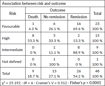 Induction outcomes comprised complete remission in 47%, no remission in 23%, induction death in 16% and treatment abandonment in 14%. Literature from both developed and developing countries shows remission rates of 56%–83% and induction mortality between 3% and 25% [16, 17, 2942]. When patients who abandoned therapy were excluded, only ELN risk category retained a statistically significant association with outcome: high-risk patients were more likely to fail induction or die, while favourable-risk patients achieved higher remission rates. This association has been consistently reported in prior studies [3033].